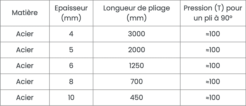 La capacité de pliage dépend de la longueur de pliage, soumise entre le poinçon et la matrice, comme dans les exemples ci-après :